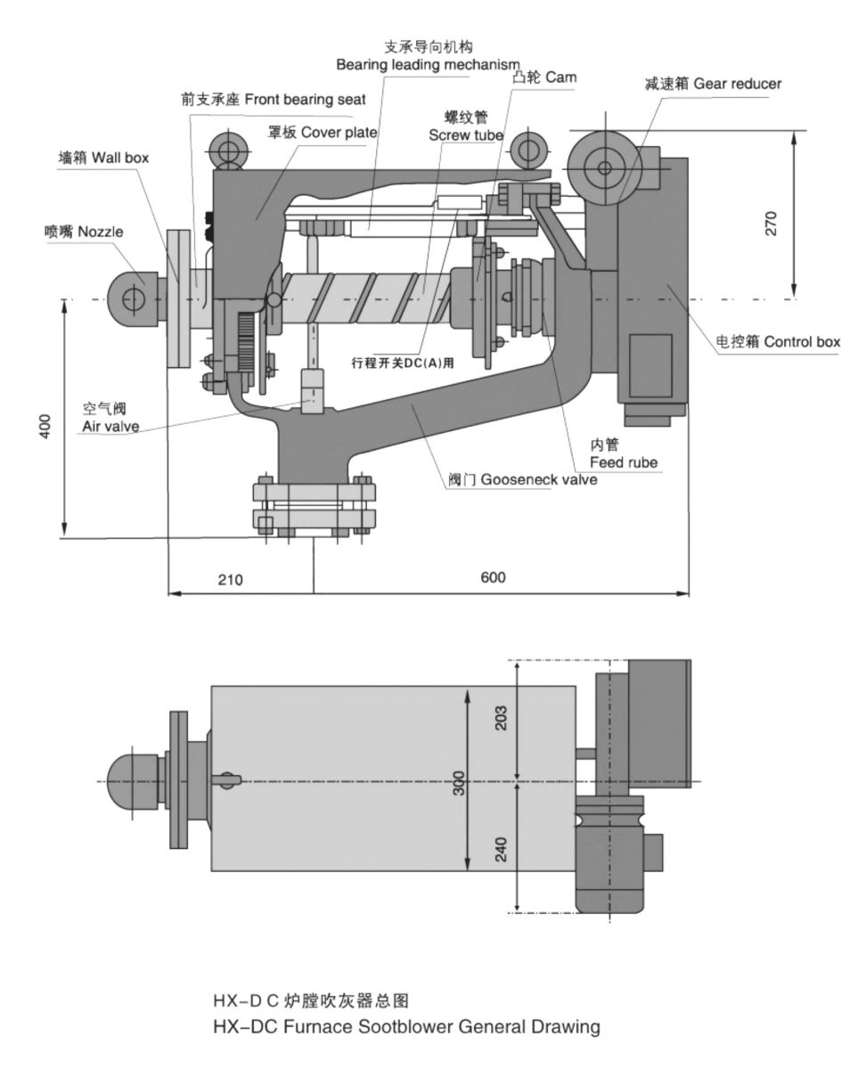 HX-DC吹灰器主要由鵝頸閥、內(nèi)管、吹灰槍與噴頭、減速傳動(dòng)機(jī)構(gòu)、支承板、導(dǎo)向桿、電氣控制機(jī)構(gòu)、防護(hù) 罩組成。